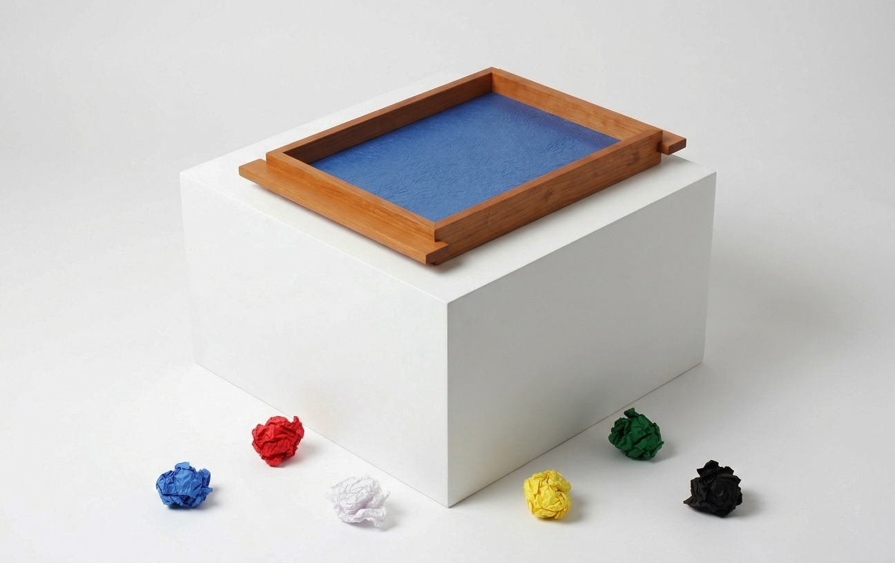 Como uma moldura a bandeja paleta valoriza as cores e texturas do seu do papel amassado protegido por um vidro.
