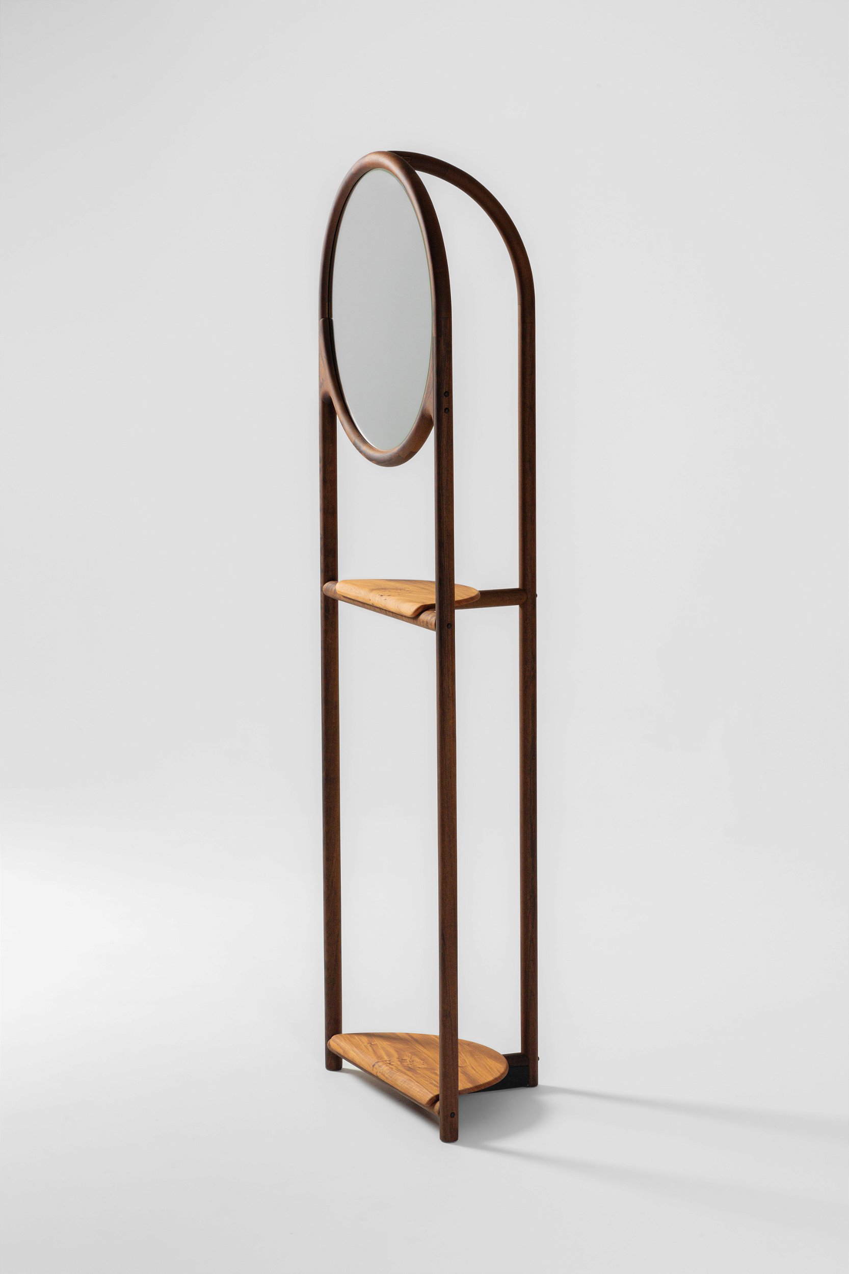 A madeira torneada sustenta o espelho em uma estrutura delicada, de traços limpos.