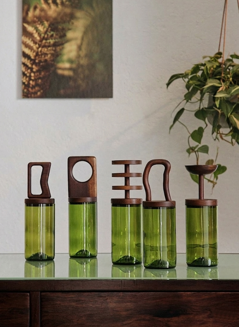 Para a produção das tampas utilizamos um antigo assoalho de imbuia que após a retirada de pregos e de sua casca envelhecida pelo tempo, revela toda sua beleza em tons escuros e veios desenhados. Para os copos garrafas de vinho são coletadas higienizadas e cortadas . Todo esse processo é feito de forma artesanal por mãos que transformam esses materiais com todo carinho ,para que ganhem uma nova vida.